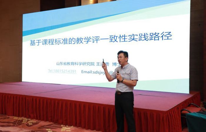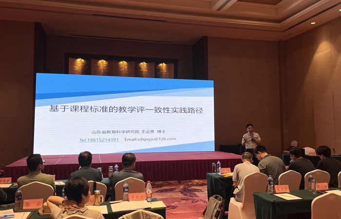 来自山东省教育科学院的王运贵博士带来以《基于课程标准的教学评一致性实践路径》为主题的专题讲座,为三中教师分享了他对新课改背景下的教学评价的全面认识。首先王博士引用《学记》阐明了自古及今不同学段应掌握相应的知识和达到相应的水平;接着王博士围绕党和国家高度重视教育评价改革,列举了自党的十八大以来,习近平总书记关于教育评价改革的系列重要讲话;以新修订的课程标准的核心内容系统回答了“学习者形象是什么”、“学什么”、“怎么学”、“学到什么程度”等四个问题引出了课程标准引领教学评一体化设计;提出实施教学评一致性的技术路径的三个核心要点,即教学目标、持续性评价和结构化的学习活动。最后王博士以实例分析各个学校应根据自己学生的学情特点进行合理的分数转换,才能确保分数等级的科学性和合理性。