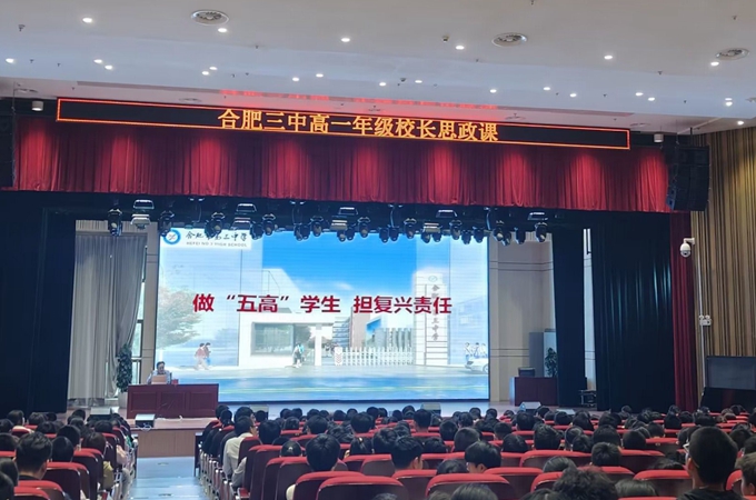 为落实立德树人根本任务,引导广大学子坚定理想信念,厚植爱国主义情怀,树立正确的世界观、人生观、价值观,激励他们肩负时代使命,为实现中华民族伟大复兴的中国梦而努力奋斗。5月24日下午,合肥市第三中学高一年级全体学生在君尧楼会堂开展了以《做“五高”学生,担复兴责任》为主题的思政课教育活动,校长毛晓斌主讲,高一年级部主任蒋自路主持,高一年级全体学生参加了本次活动。