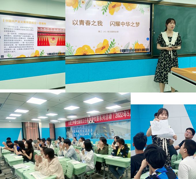 高二(4)班主任孙一乔老师以《以青春之我 闪耀中华之梦》为主题,引导同学们在实现中国梦的伟大奋斗中实现自身价值,努力书写无愧于时代的华彩篇章。孙老师从今年中国共青团成立一百周年谈起,通过寄一封邀请信的方式串联课堂,活泼有趣。登上和谐号列车、登上辽宁号航空母舰、登上嫦娥五号……在同学们绘声绘色的讲述中,大家仿佛身临其境地感受着时代脉搏的有力跳动。“芳华心向党,百年正青春”一封倡议书的发起,也让同学们再次感受到青年生逢盛世,当勇担重任。