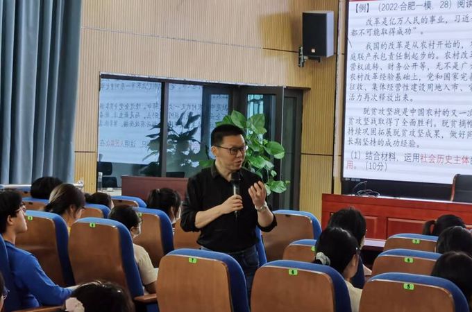 在时长近两个小时的讲座里,侯老师从“立意、设问、情境、答案和备考建议”五大方面对核心素养下的高考临考备考策略进行了深入细致地阐述。为了帮助学生更透彻的理解,侯老师每讲一个方面都会呈现与之相关的高考真题或近两年合肥市模考试题,让同学们现场作答。随后,针对学生的回答进行鞭辟入里的分析,引导学生探究高考答题逻辑,掌握答题技巧,并向同学们介绍了以单元和大概念为核心整合教材的复习策略以及四大模块的命题主线。最后,侯老师真诚的祝愿同学们:踔厉奋发谋备考,笃行不怠向未来!祝大家虎虎生威,今年有个好收成!