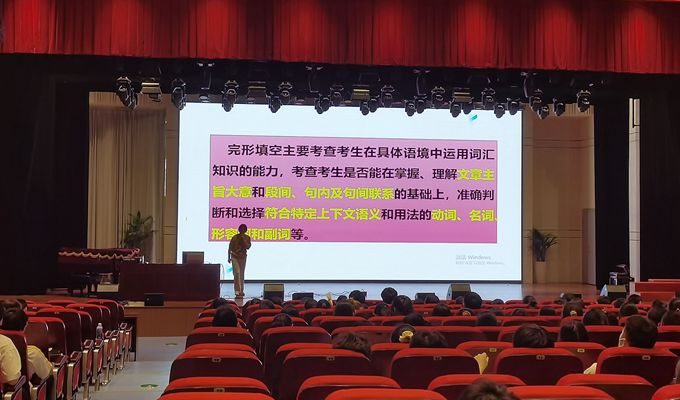 为了进一步做好高三英语复习迎考工作,准确把握英语高考试题的命题规律,提高备考效率,点点手机版下载官网app5月21日特别邀请了合肥六中英语名师方芳莅临学校开展讲座,高三全体学生和英语教师齐聚正谊会堂聆听方芳老师带来的“完形填空解题策略”,讲座由薛中华老师主持。