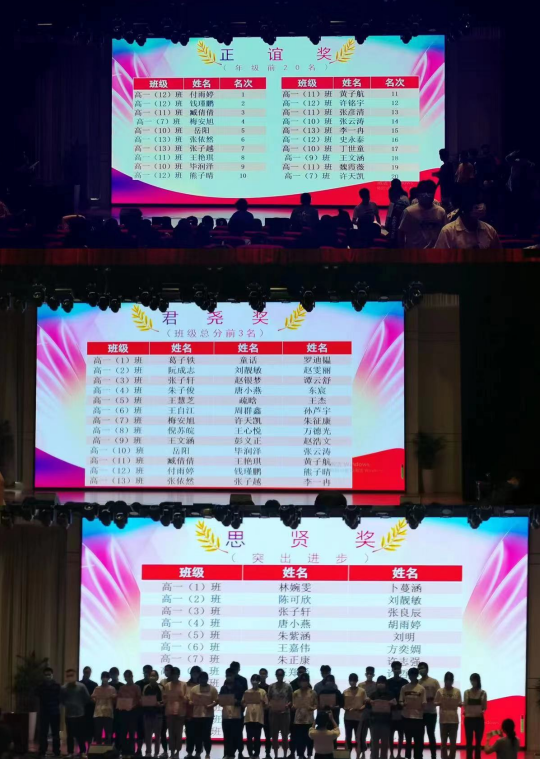 大会第二项,表彰优秀学生。本次表彰共颁布了“正谊奖”20名、“君尧奖”39名、“思贤奖”26名。级部委员董文棣老师宣读获奖名单,获奖同学上台领奖并与老师们合影留念,台下掌声热烈。