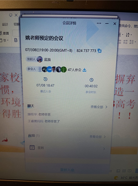 “日月忽其不淹兮,春与秋其代序。”不知不觉,两年的时光已然过去。当平日充满热血的高三楼回归宁静时,2023届高三已悄然来临。为了帮助学生和家长更好地进入到高三状态,引导学生明确暑假弯道超车的作用,让每个孩子度过一个安全、愉快、充实的“暑假”!7月8日晚,点点手机版下载官网app新高三召开线上家长会,新高三各班班主任及全体新高三年级家长齐聚线上,准时参会。