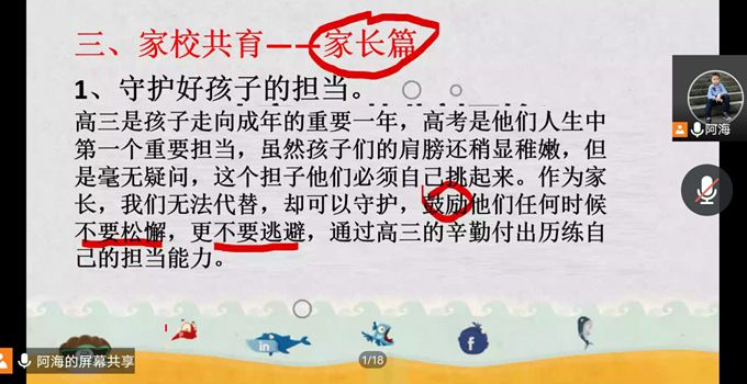 苏霍姆林斯基说:教育的效果取决于学校和家庭的教育影响的一致性。如果没有这种一致性,那么学校的教学和教育过程就会向纸做的房子一样倒塌下来。通过本次线上家长会,实现了家校互动,进一步增强了学生安全意识,明确了高考目标,为下一步毕业班复习备考工作做好了充分的准备。