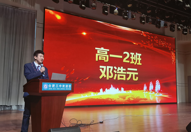 会议第二项,优秀学生代表高一2班邓浩元同学发言。他向同学们分享了学习中的点滴经验:确立切实可行的目标、保持端正的学习态度、设置合理的学习计划、培养良好的抗压能力,以及保持和谐的师生关系。邓元浩同学用活生生的例子证明了人生不设限,一切皆有可能!