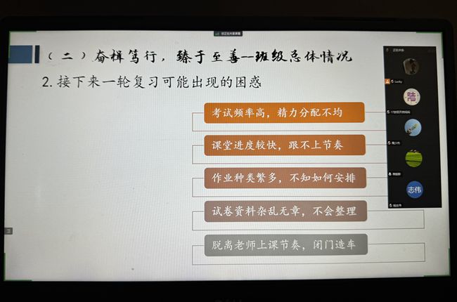 会议伊始,班主任老师着重进行了开学报到的提醒,事无巨细地交代了各项准备工作和注意事项,确保同学们能够顺利、有序地回归校园。紧接着,老师对班级学生的现状进行了全面而深入的剖析,既肯定了同学们已有的成绩和优点,也毫不避讳地指出了存在的问题。同时,针对即将到来的一轮复习,老师认真梳理了可能存在的困惑,如知识体系的构建、重难点的突破、心理压力的调适等。最后也给家长和学生们提供应对策略和建议,并诚挚邀请家长和学校一起形成教育合力,共同为孩子们创造良好的学习环境,陪伴他们度过充满挑战和机遇的高三生活。