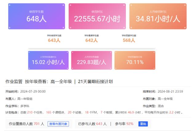 此次新生综合素质提升实践活动为期21天,在7月29日——8月21日期间,点点手机版下载官网app新高一学生参与假期学习人数648人,参与率达92.44%,人均使用时长高达34.81小时,排名位居全市前列。按照20分钟/节课来算,人均看课45节,相当于假期外出补课20节(看课时长/45min),同学们在假期养成了勤奋刻苦、自觉自发、作息规范等重要的优秀学习品质。