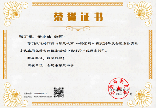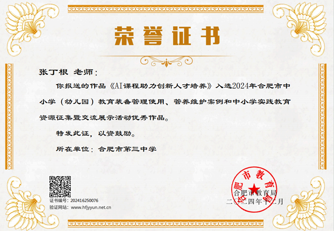近日,合肥市中小学(幼儿园)教育装备管理使用、管养维护案例和中小学实践教育资源征集暨交流展示,以及2024年度合肥市教育数字化应用优秀案例评选两项活动结果正式公布。合肥市第三中学报送的两项作品——“智慧心育 一路繁花”和“AI课程助力创新人才培养”分别成功入选,展现了学校在心理健康教育和人工智能课程建设方面的创新实践与突出成果。