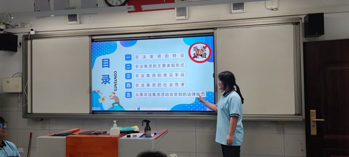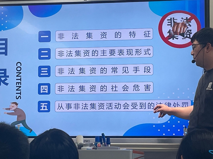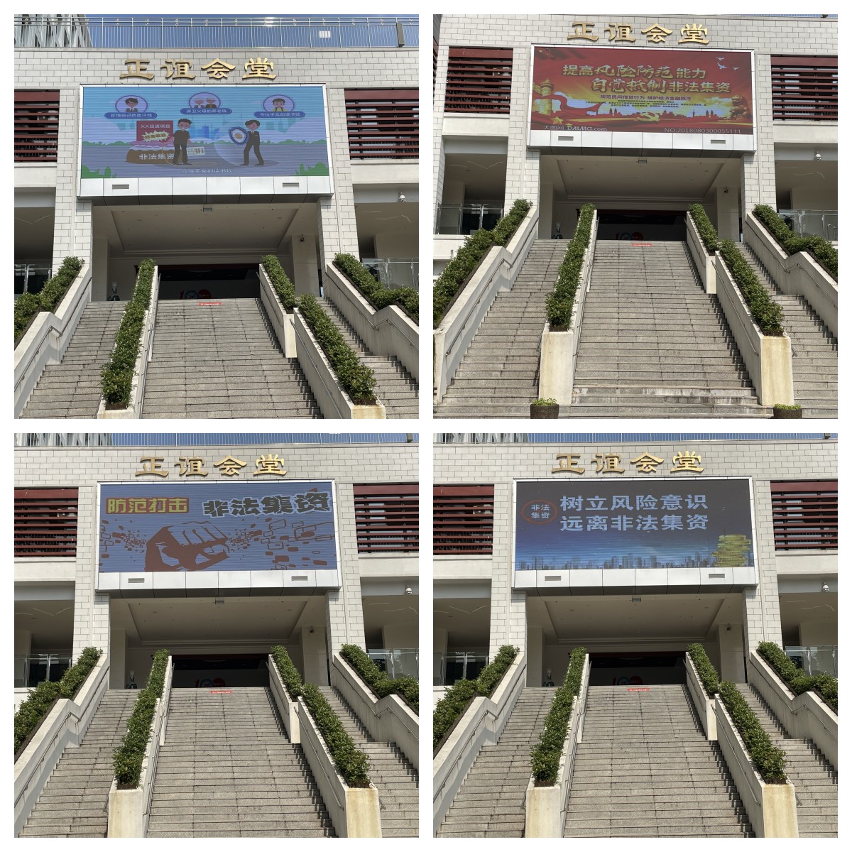 活动通过开展主题教育班会、集中观看宣传片、LED大屏宣传等多种形式宣传防范非法集资相关内容。引导树立“不组织、不协助、不参与非法集资”的意识,更好地维护自身合法权益。