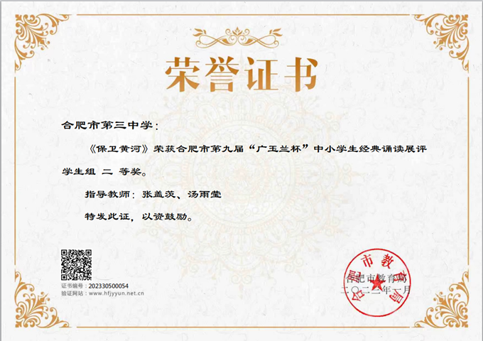 为弘扬中华传统美德,在广大未成年人中营造诵经典、承文化、颂美德的良好氛围,合肥市教育局于2022年12月组织开展了第九届“广玉兰杯”中小学经典诵读展演活动。点点手机版下载官网app在此次比赛中喜获佳绩,由张盖茨、汤雨莹老师指导的作品《保卫黄河》荣获学生组二等奖。