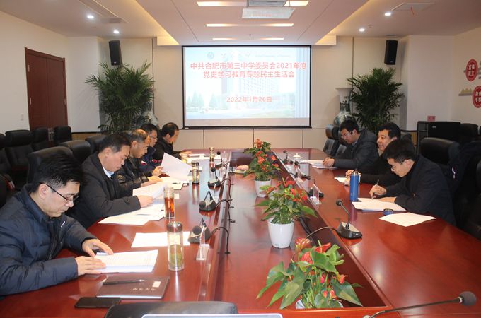 根据市教育局党委《关于认真开好局党委直属党组织党史学习教育专题民主生活会的通知》要求,1月26日下午3点30分,合肥三中党委在学校君尧楼9楼会议室召开2021年度党史学习教育专题民主生活会。合肥市教育局四级调研员费勇、宣传处罗林东、合肥市学生事务管理中心张少华以及学校党委班子全体成员参加,会议由党委书记马剑主持。