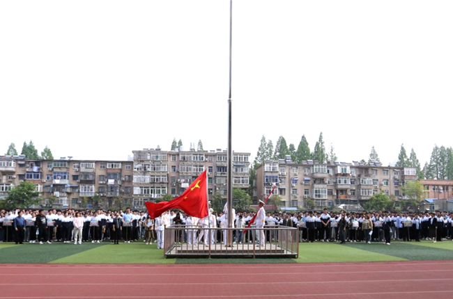 师生们在操场上整齐肃立,飒爽的国旗护卫队员昂首阔步,护送国旗行至升旗台。随着嘹亮的国歌声响起,鲜艳的五星红旗冉冉升起、随风飘扬。