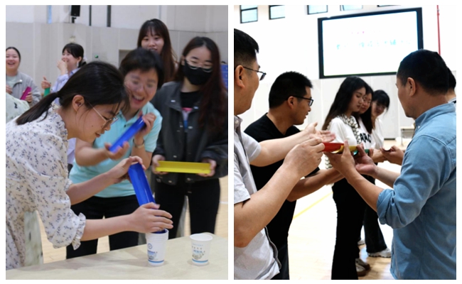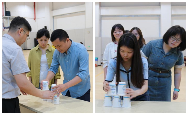 第二个活动“纸杯接力赛”,各组8名队员列队就位,前一名队员将6个纸杯叠起,后一位队员再将纸杯收纳,循环至结束,用时最短为获胜组。比赛在欢乐又紧张的气氛中进行,其乐融融……