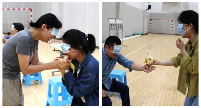 第三个活动“蒙眼吃香蕉”,每支队伍起点方的老师蒙上眼睛,听到开始信号后,跑向终点方,把香蕉准确喂给终点方的队员。此游戏锻炼参与者的知觉应变能力和配合默契度。游戏中,每支队伍的成员都通力合作,争先恐后,争取以最快的速度完成任务,欢声笑语充斥现场。