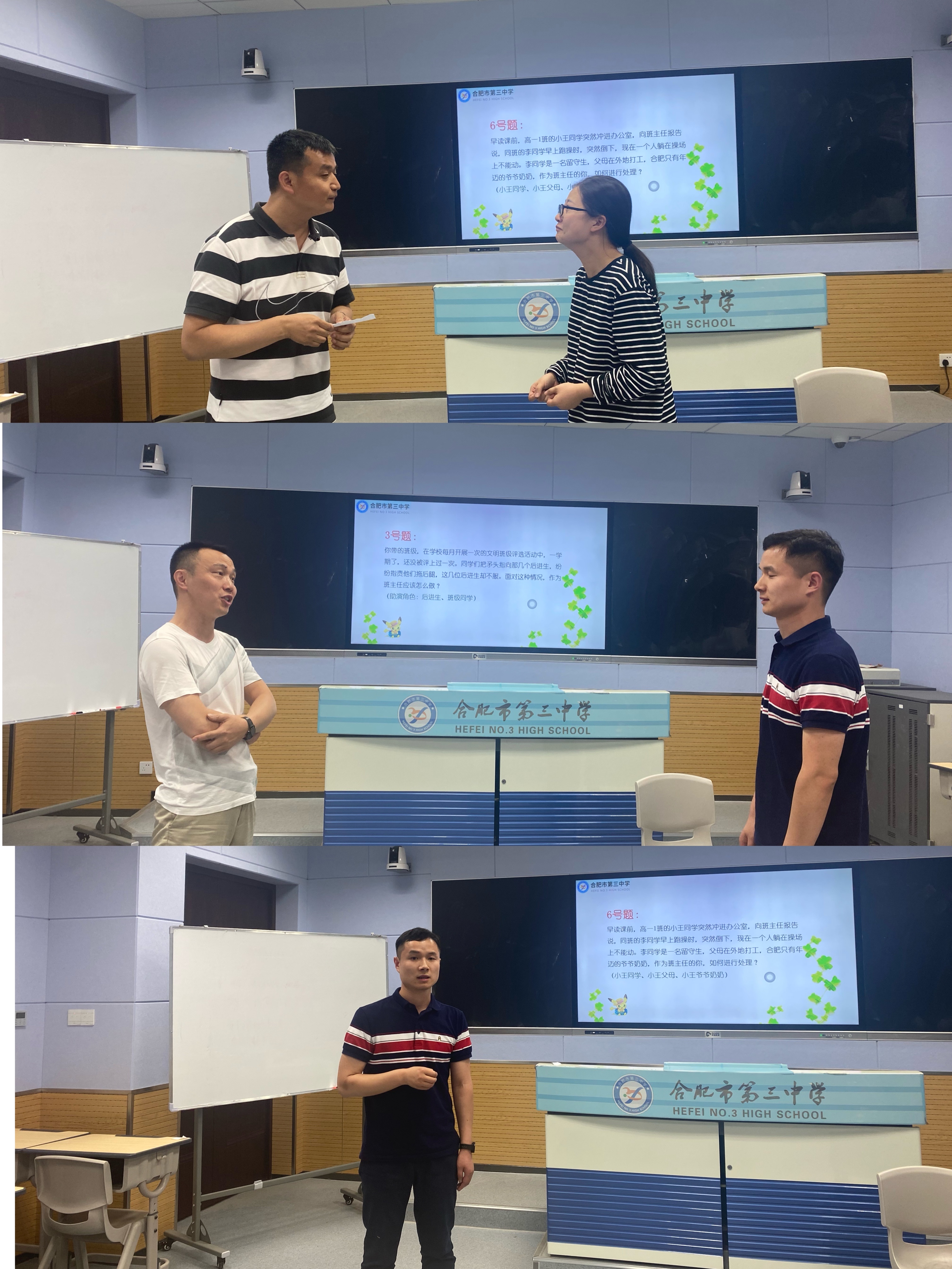 比赛共分为笔试和面试两个环节。笔试即初赛环节,参赛教师需在规定时间内完成教育基础理论选择题和主题班会课教学设计。经过选拔共有13位优秀班主任代表进入决赛参加面试。面试环节采用当场抽签的方式,参赛选手根据所抽题目提供的假定教育情境,通过和助演互动完成“班主任角色”表演,提出解决问题的策略和方法,旨在考察班主任们的教育理念、教育智慧以及临场应变能力。情景模拟涉及到家校沟通、学生心理健康、校园安全、班级突发事件处理等多个场景。