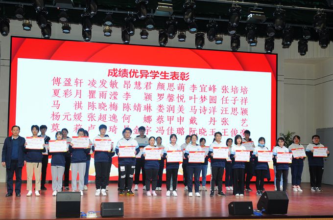 在正谊会堂现场,学校表彰了一大批成绩优异的学生,并为他们颁发奖状、合影留念。