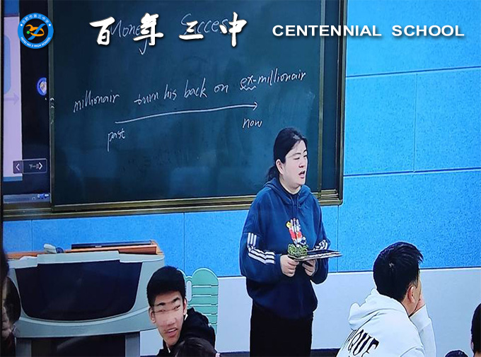 紧接着上课的是王鑫老师,王老师通过一位成功人士导入,让学生深入讨论。激发学生兴趣,引出本节课的主题。王老师让学生根据标题预测阅读内容,并说明文本类型。锻炼学生预测的文本信息能力。在文本阅读环节,王老师以十字导图形式,呈现文本主要的内容框架,通过问题指导学生深入思考阅读,她关注学生学习状态和阅读效果,给学生充分的时间讨论。读后展开了小组活动,王老师提出有关金钱的开放性问题,请多名学生发表了对主人公行为的见解,学生各抒己见。课程结束,王老师对学生们的观点给出了中肯的评价,并做出总结。