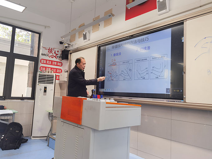 课程开始之前,周新民老师引导学生回顾高中地理学习过程中涉及到的等值线问题,例如:等温线、等高线、等压线等。结合期中考试的情况,明确等值线问题在高中地理学习中的重要作用,并以“常见等值线的判读方法”为主题,开展专题教学。新课教学过程,主要分为两部分。