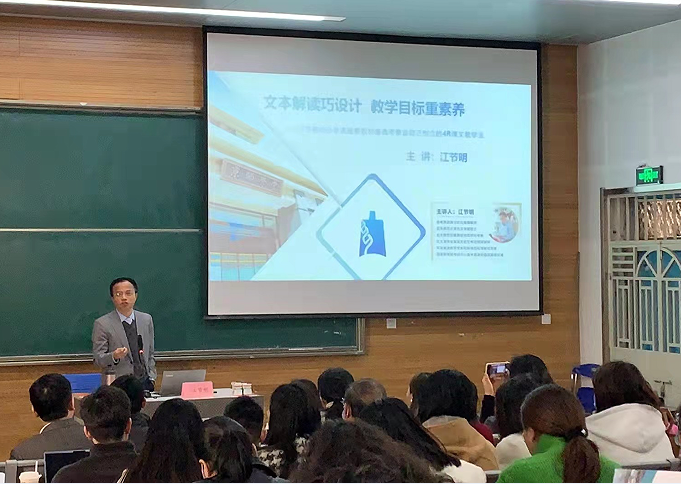 会议首先由六中副校长李勇致辞讲话,随后,江节明教授在会议上分享“双新”研究的成果。江教授讲授的内容一共分六个部分:一、新课程新高考的概况,二、4R课文教学法与核心素养,三、单元话题解读与教学目标,四、视听说的设计与能力目标,五、阅读教学设计与能力目标,六、写作教学设计与能力目标。