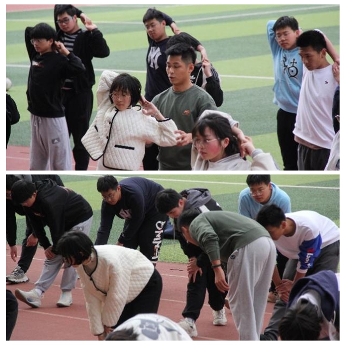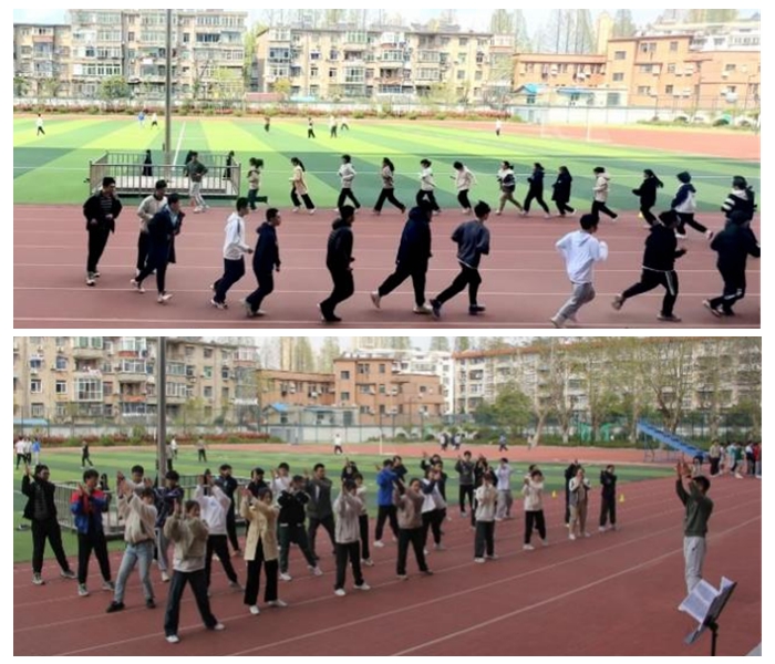 教师带领学生进行慢跑与热身操练习