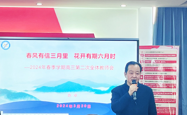 会议第二项,陈卓副校长作主题为“春风有信三月里,花开有期六月时”的讲话。他对高三年级的教学工作给予了高度肯定,并从“做好一模学情分析,总结一轮复习得失;正视存在问题,落实根本措施;做好后期安排,全力提升成绩”三个方面给出了具体的指导意见。陈校长强调在后期复习中,全体高三教师务必进一步做到“思想上引导、心理上疏导、行为上督导、学法上指导、学科上辅导”,坚定信心,全力以赴抓落实,质量再上新台阶。