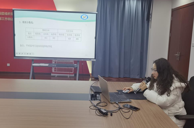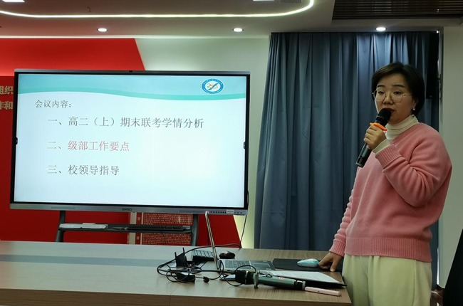 会议伊始由级部教学委员姜薇薇对高二上学期期末联考数据作详细分析。姜薇薇老师结合数据与案例,从学业总成绩、学科成绩亮点、学生学业所取得的稳定进步、存在问题带来的反思以及改进建议等多维度剖析本次联考情况。