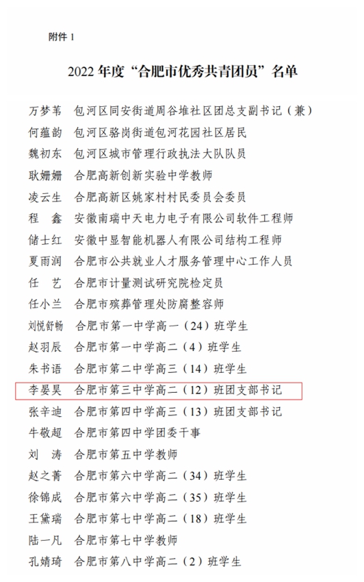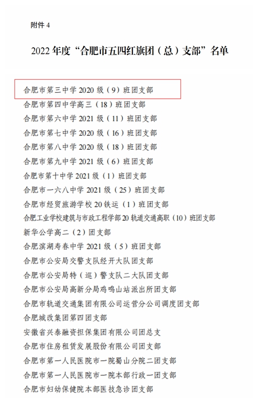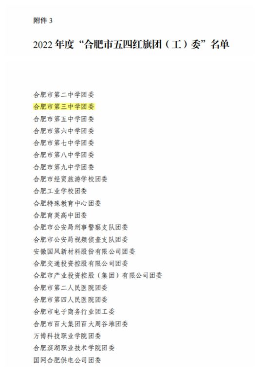 2023年5月4日,共青团合肥市委员会发布表彰决定,合肥市第三中学团委荣获2022年度“合肥市五四红旗团委”,点点手机版下载官网app2020级9班团支部荣获“合肥市五四红旗团支部”,点点手机版下载官网app高二12班团支部书记李晏昊荣获“合肥市优秀共青团员”。这是点点手机版下载官网app继2017年荣获合肥市教育系统“五四红旗团委”、2021年荣获“合肥市五四红旗团委”后,再一次荣获共青团合肥市委员会授予基层团组织的最高荣誉。