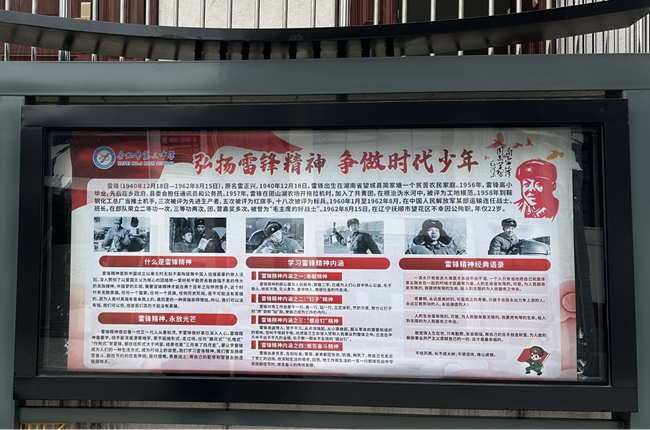 此外,结合环保教育,加强校园精神文明建设,掀起校园学雷锋活动新高潮,校团委联合政教处在校内组织开展了学雷锋精神主题国旗下演讲、校园橱窗展示学习雷锋海报、班级电子班牌及校园LED大屏宣传学习雷锋倡议、学雷锋主题团课、主题黑板报等活动。