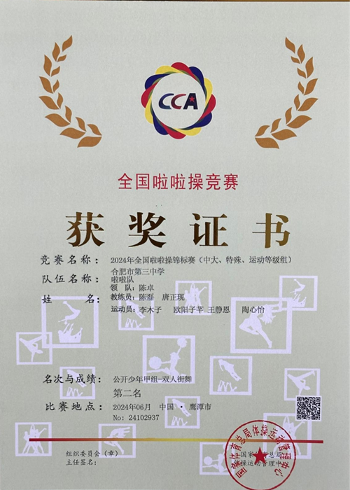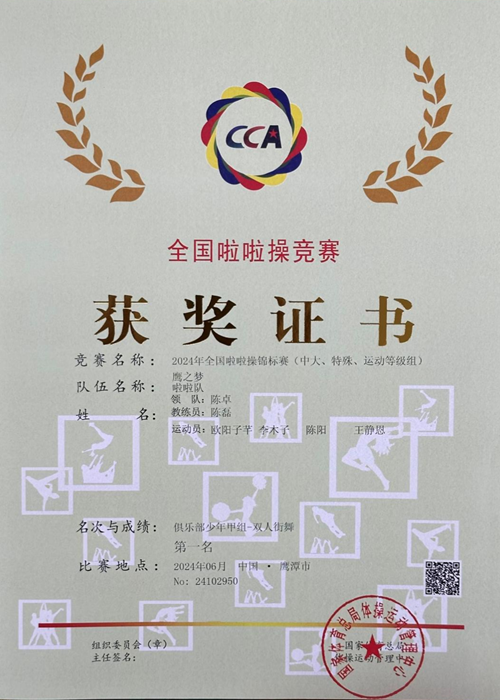 6月1日-5日,由国家体育总局体操运动管理中心、江西省体育局和鹰潭市人民政府主办,江西省体操运动管理中心、鹰潭市体育局承办的2024年全国啦啦操锦标赛在江⻄省鹰潭市拉开帷幕。本次比赛是啦啦操全国最高水平赛事,来自全国29个省级行政区4755名运动员和教练员参加。点点手机版下载官网app派出校啦啦操队员参加了双人街舞、双人爵士两个项目的比赛,在教练员陈磊和唐正现的带领下,最终取得俱乐部少年甲组双人街舞、双人爵士冠军,公开少年甲组双人街舞亚军、双人爵士第四名的优异成绩。