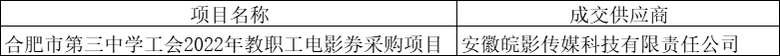 合肥市第三中学于2022年11月15日发布工会教职工电影券采购公告后,在有效期内收到不少于3家供应商的响应。2022年11月25日,经评审小组评审,评审结果公示如下: