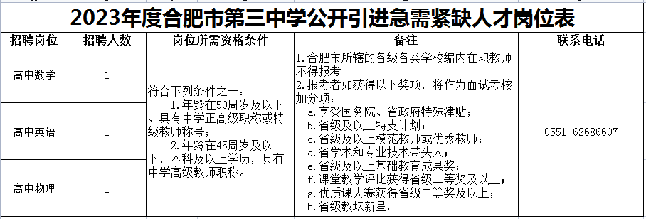 为加强高素质专业化创新型教师队伍建设,经批准,合肥市第三中学面向全社会公开引进3名优秀教育人才(高中数学1人,英语1人,物理1人)。现将有关事项公告如下: