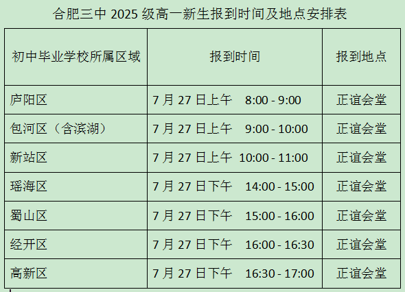 2025级新生报到时间为7月27日全天,具体报到时间段见下表。家长也可根据手机短信平台发送的个人通知按时前来报到。