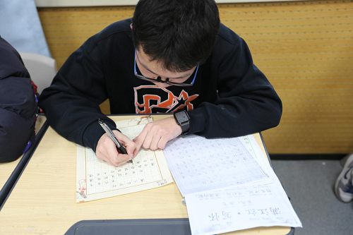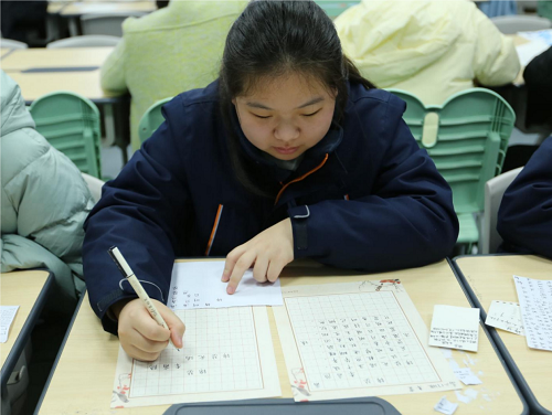比赛分为硬笔和软笔两类,比赛过程中,同学们个个屏气凝神,坐姿端正,起笔、收笔,藏锋、逆锋,转折、提按,或是遒劲有力,或是俊秀娇美,或是飘逸潇洒,或是厚重稳健……比赛现场墨香四溢,同学们个个满怀热情,泼墨挥毫,一笔一画认真书写每一个汉字。