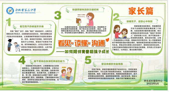 从家长、孩子、教师的视角出发,定制属于不同群体的心理健康知识,如家长如何陪伴青春期孩子成长、教师如何进行心灵维护以及学生面对早恋如何处理等心理健康知识,并通过展板的形式,向师生及家长进行普及,让他们了解、掌握心理健康知识,促进更好地交流和生活。