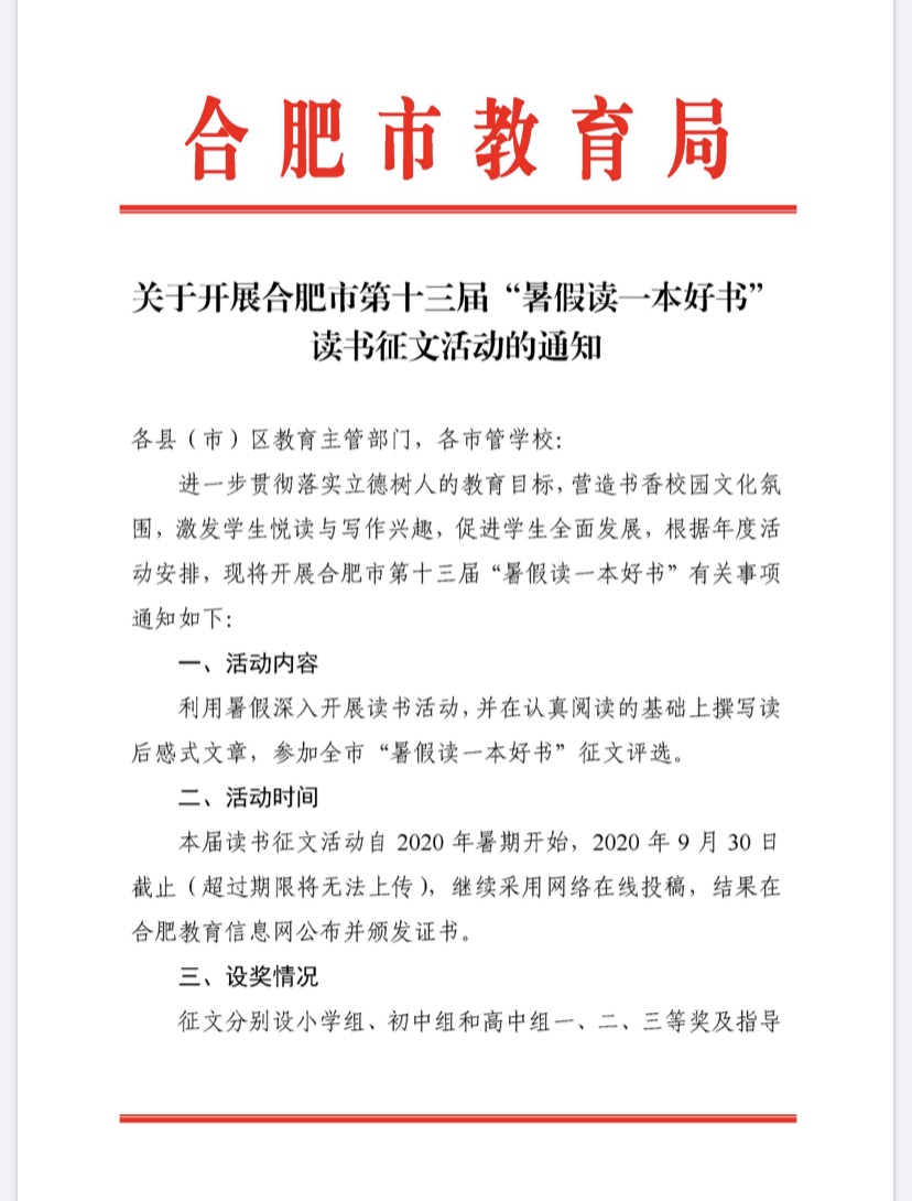 合肥市中小学“暑假读一本好书”读书征文活动是由合肥市教育局主办的阅读品牌活动,每年暑期举行一次,已经连续举办了13届,深受广大师生欢迎。旨在贯彻落实立德树人教育目标,营造书香校园文化氛围,促进学生全面发展。