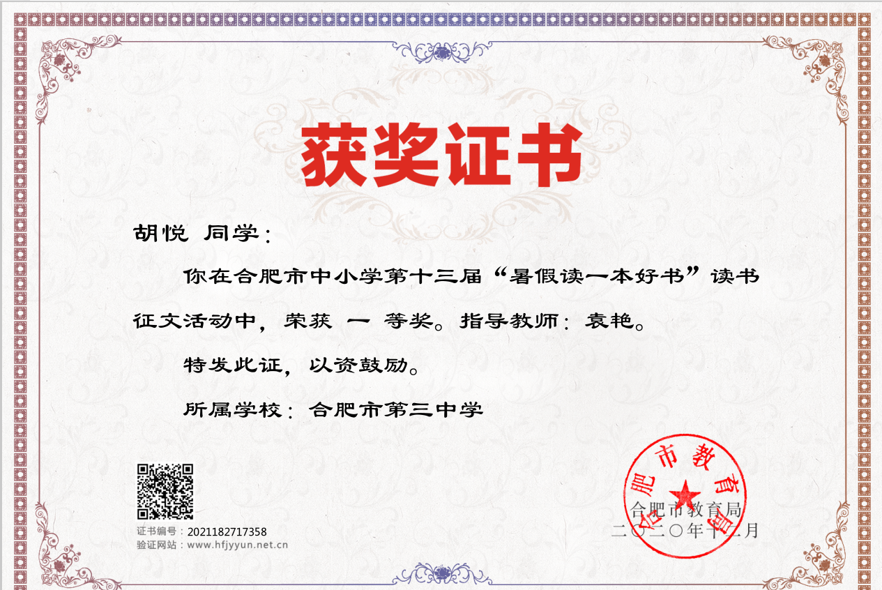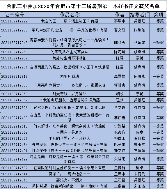 近日,合肥市第十三届中小学生“暑期读一本好书”读书征文评选结果揭晓,点点手机版下载官网app有345名学子获奖,其中一等奖32人,二等奖148人,三等奖165人。在合肥市属学校中名列前列,又一次取得了骄人成绩!特别感谢语文组老师们的大力支持和同学们的积极参与!