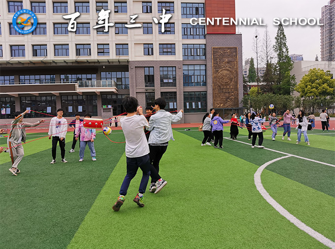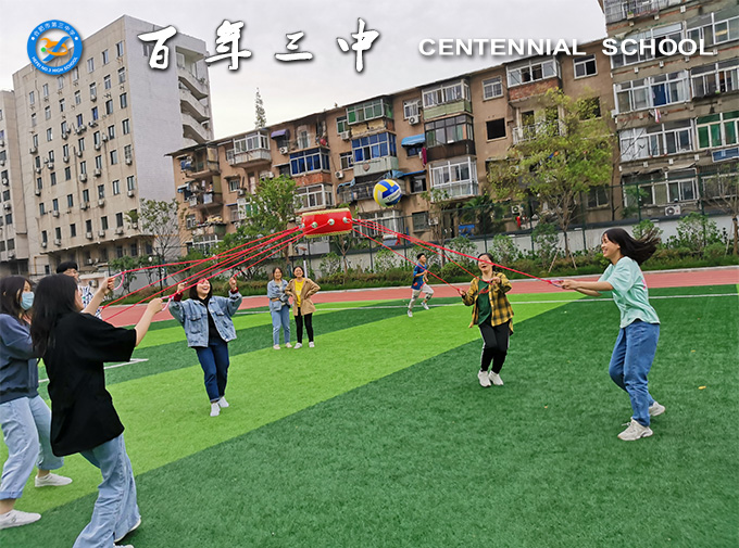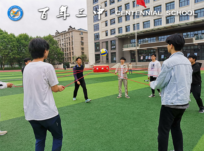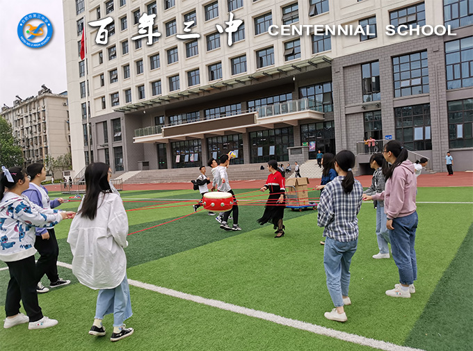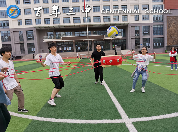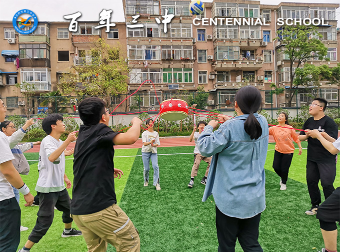 接下来,同学们在老师的指导下进行了团队协作活动“击鼓颠球”。同学们找到小伙伴,组建10人或5人的团队,每人牵拉鼓上的一根或两根绳子,并指定一人将球放在鼓面上,大家齐心协力,在规定的时间内让鼓有节奏、平稳地将球连续颠起。