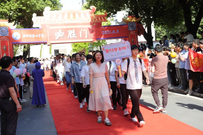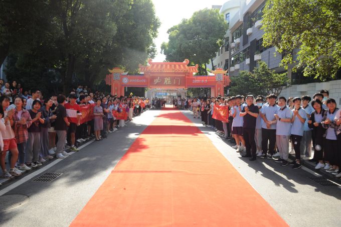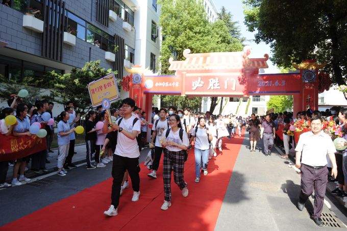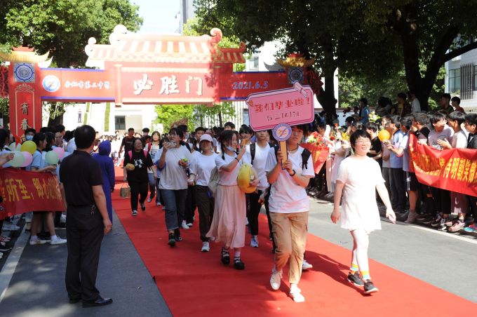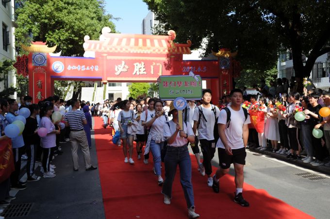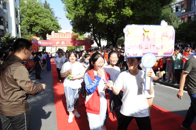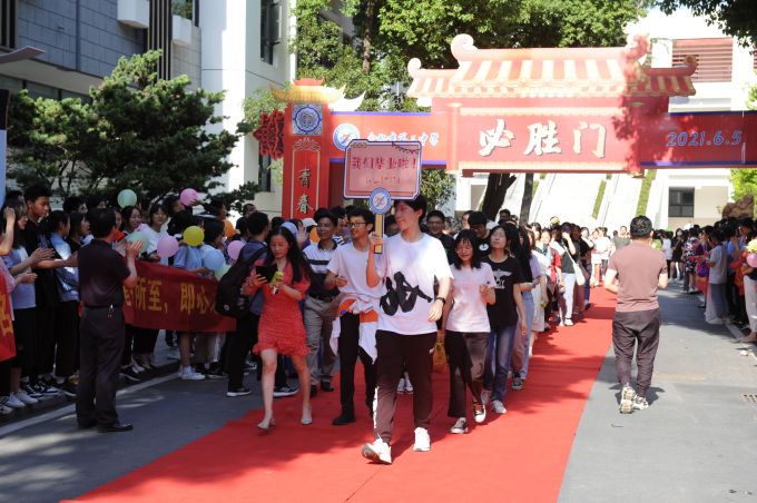 随后各班列队在班主任和班长的带领下,怀揣梦想跨越“必胜门”。沿路夹道送行的是高一高二的学弟学妹们,他们高喊口号,挥动励志的标语牌,为学长送去离校前最后一段美好回忆。一切的一切,是学校的祝福,是老师的期盼,是三年来无数日日夜夜的相知相伴!