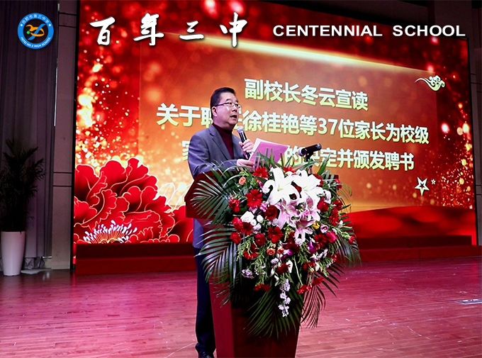 冬云副校长宣读关于聘任徐佳艳等37位家长为2021-2022年度校级家委会成员的决定,校领导为新一届家委会成员颁发聘书。