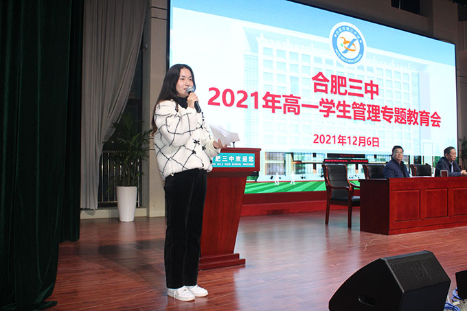 冬云首先回顾三个月以来高一、高二年级整体情况,指出现阶段学生日常行为表现中存在的问题。表扬“零迟到”班级,鼓励他们发挥标杆作用,号召其他班级向他们学习。希望同学们“知校规、守校纪、明方向、定目标”。并且提出三点要求:增强遵守规章制度意识;树立正确的价值观;明确目标,端正态度,做文明、合格、优秀三中学子。