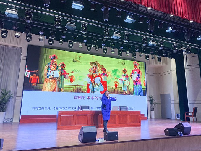周斌老师以其生动渊博的知识从戏曲剧种开篇,深入浅出,娓娓道来,帮助同学们了解了京剧的起源与发展、四大徽班的概况、京剧艺术中的“四功五法”、京剧流派、京剧声腔形式、京剧花脸脸谱、戏曲行当等等戏曲基本知识;又亲身示范指导了学生兰花手、兰花指等基本唱曲动作,惟妙惟肖的演示让同学领悟了表演的核心“四功五法”,让现场的师生直观地领略到戏曲的文化内涵与艺术美感。