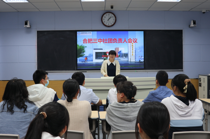 李晓娟主任首先带领所有社团负责人认真学习并解读了《合肥市第三中学学生社团管理章程》,对社团负责人的职责提出了明确要求,对社团的成立登记注册、经费管理、宣传活动管理、社团成员的考评奖惩等做了明确规范,重申了学校对社团的管理要求。特别强调了学生社团的“引领、成长”功能,社团不仅仅为学生提供了展示自我能力与发挥创造力的舞台,开阔眼界,增加人生阅历,为学生成长发展引领方向,而且还可以起到放松心情舒缓压力的作用。适度的开展社团活动,对于目前校园疫情防控常态化情况下舒缓学生心理负担起到重要作用。同时也例举了部分优秀校友当年在学校参与社团活动时所取得的优异成绩,激励在场的同学们认识到优质的社团活动可以让高中生涯更精彩。