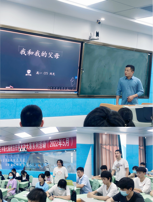 下午4:00两节精彩的主题班会课展示活动。高一(7)班主任刘光老师以《我和我的父母》为主题,旨在增强同学们与父母之间的沟通能力,学会换位思考,提升理解和包容能力,构建和谐亲子关系。刘老师以两个短视频导入,引导学生思考父母为我们做过的感动的事以及父母面对哪些压力等。一个个事例激发思考,同学们积极分享,畅所欲言,师生共同探讨。
