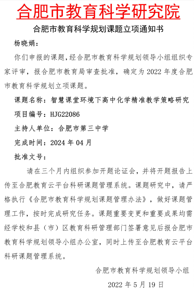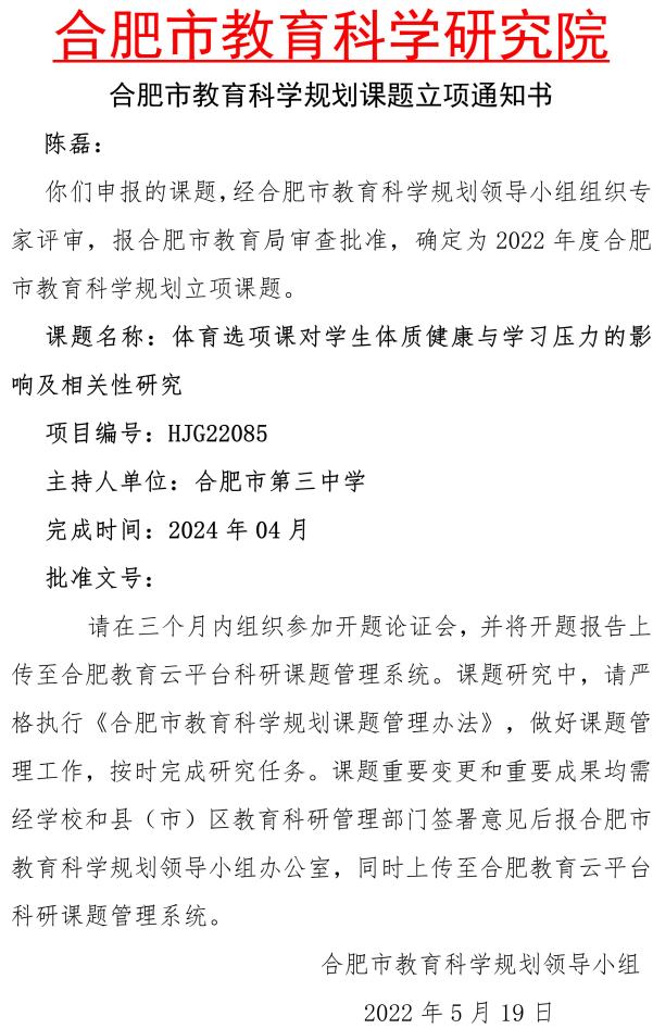日前,在2022年度合肥市教育科学规划课题申报工作中,经过经市专家组认真评选,报市教育局审查批准,点点手机版下载官网app有两位老师的的课题成功立项,它们分别是点点手机版下载官网app陈磊老师主持的课题“体育选项课对学生体质健康与学习压力的影响及相关性研究”,立项编号为HJG22085;杨晓娟老师主持的课题“智慧课堂环境下高中化学精准教学策略研究”,立项编号为HJG22086。