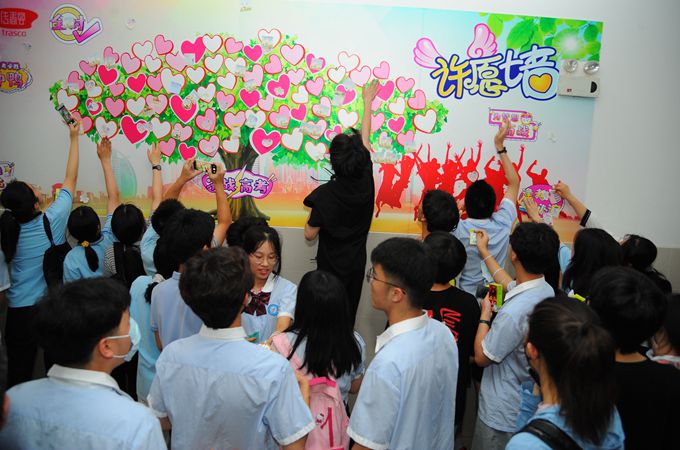 精心的布置,美味的糕点。在三中一楼校园餐厅里,超多美味等待着高三学子前来品尝。舌尖上的美味,是三中送给同学们的一份“甜蜜大礼”。现场有“马到成功-金榜题名”的超长型大蛋糕,还有水果、糕点、气球、许愿墙。