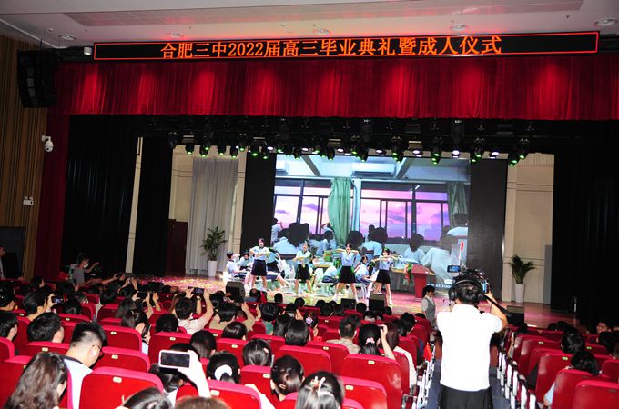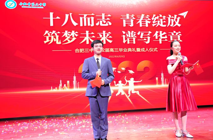 硕果累累迎六月,浓情依依话惜别。6月9日上午,合肥市第三中学2022届高三学子踏过荆棘、满载收获、怀揣梦想,迎来了专属于他们的毕业典礼暨成人仪式。合肥市教育局学生事务管理中心主任孙伟,合肥市教育局团委书记史东伟,该校党委书记马剑,校长毛晓斌,副校长冬云、副校长陈卓及学校中层以上领导和高三年级全体师生、家长代表们共同参加了毕业盛典。来自高二(12)班周夏瑾儿和高一(3)班的年霄汉担任活动主持人。