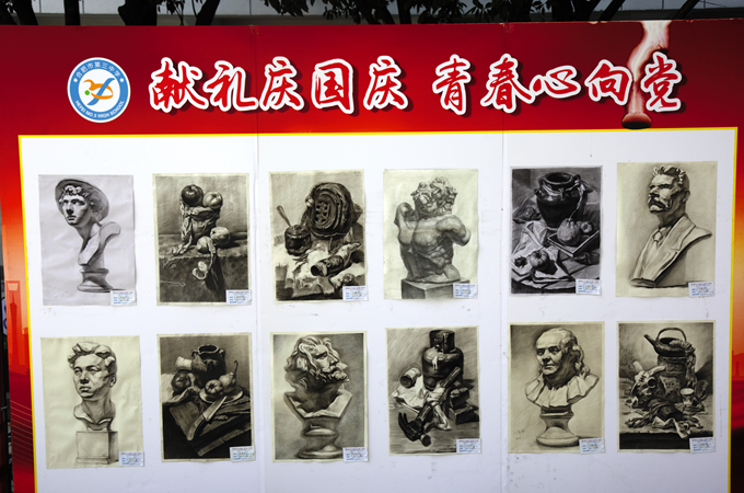 本次活动得到了同学们的积极响应,有近两百名同学踊跃报名参加。同学们提交了书法、版画、国画、素描、水彩等形式多样的作品。经政教处、美术组选拔评比,最终遴选出八十余份优秀作品进行展出。展出作品风格鲜明、各具特色:有方正规矩的楷书,有飘逸清秀的行书,有气势磅礴的山水画,有唯美写实的素描。每一抹色彩都映射出同学们对祖国的祝福,每一笔丹青都显示出同学们对祖国的礼赞。