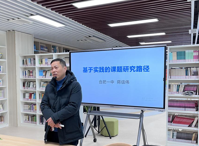 会议首先由特级教师、正高级教师、合肥一中教科所所长蒋信伟为青年教师开设专题讲座《基于实践的课题研究路径》。蒋老师从课题研究的选题指向、课题申报的设计论证、课题研究的实施过程和小微课题的常态研究四个方面向参会教师分享基于实践的课题研究路径。在选题指向方面,蒋老师阐明了课题研究的主要类型,分析了课题选题的基本要求、主要角度和基本步骤,强调了课题标题的表达规范。在设计论证方面,蒋老师说明了《课题设计论证活页》等课题申报材料的书写要求。在实施过程方面,蒋老师通过几个案例说明开题阶段的主要过程、课题研究的过程阶段、观察笔记——现场的客观描述等环节的开展。在常态研究方面,蒋老师阐明了小微课题研究操作的基本流程和成果样态,鼓励青年教师在日常教学中挖掘选题,开展小微课题研究,解决实际问题。
