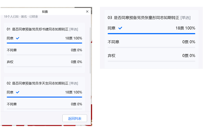会议第一项议程是讨论郑书建、李天生、张童彤三位预备党员转正事宜。三位同志分别介绍了自己在预备期间的各方面表现情况,宣读了转正申请。三位同志的培养人分别介绍了他们在预备期的表现,并表达了同意其按期转正的意见。随后,与会党员同志进行讨论并进行无记名投票表决,全票同意郑书建、李天生、张童彤三位同志按期转为中共正式党员。三位同志当场做了表态发言,表示将以党员标准严格要求自己,接受党组织的考验。与会全体党员报以热烈的掌声以示肯定和欢迎。