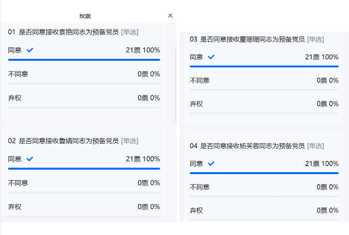 会议第二项议程为讨论接收袁艳、鲁婧、童珊珊、杨芙蓉四位发展对象为中共预备党员。会上,四位发展对象分别汇报了自己的学习工作、现实表现、家庭及主要社会关系情况,表达了自己对党组织的认识、迫切的入党心情和今后继续努力的决心。培养人分别介绍了四位同志的平时表现并表达了同意接收其为预备党员的意见。支委会向支部大会报告发展对象审查的情况。在进行充分的讨论后,与会党员进行了无记名投票表决,全票同意接收袁艳、鲁婧、童珊珊、杨芙蓉四位发展对象为中共预备党员。